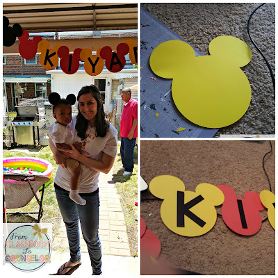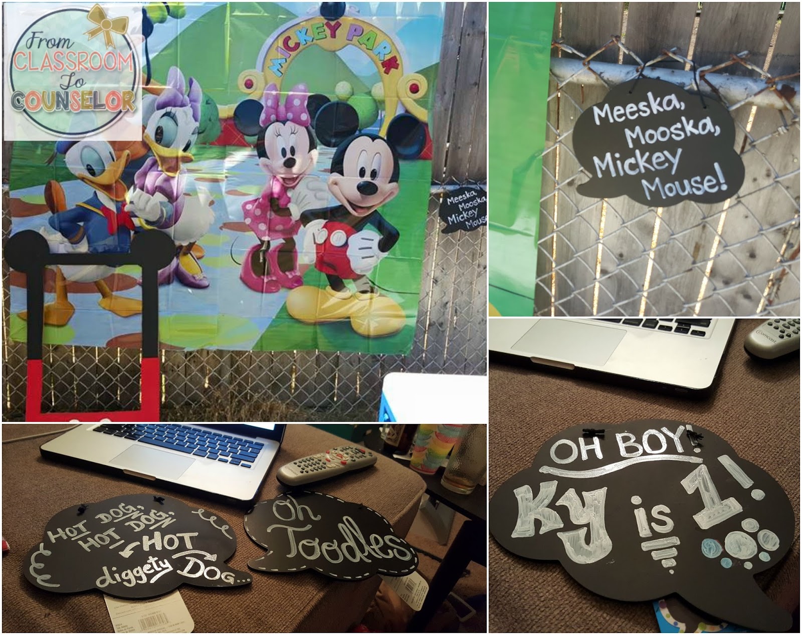 Last, we had a little photo booth going! I bought the chalkboard speech bubbles and chalk pen from Michaels. My sister, who does not fancy herself a craft person, made the Mickey frame from cardboard. I was one proud sis!